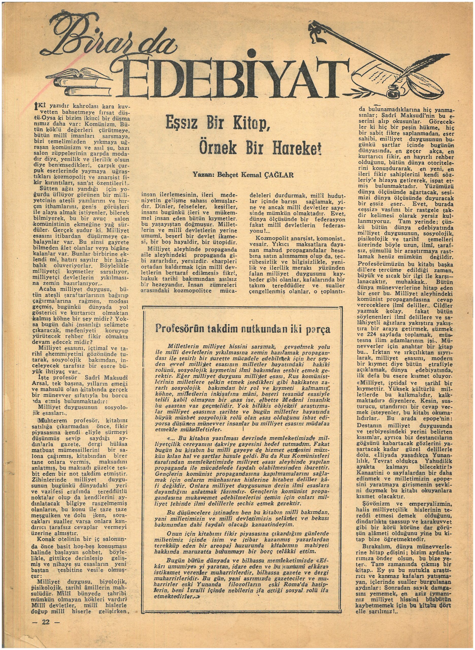 - Çağlar, Behçet Kemal, Eşsiz Bir Kitap, Örnek Bir Hareket, 20. Asır Dergisi, Sayı 151, sayfa22, 7 Temmuz 1955