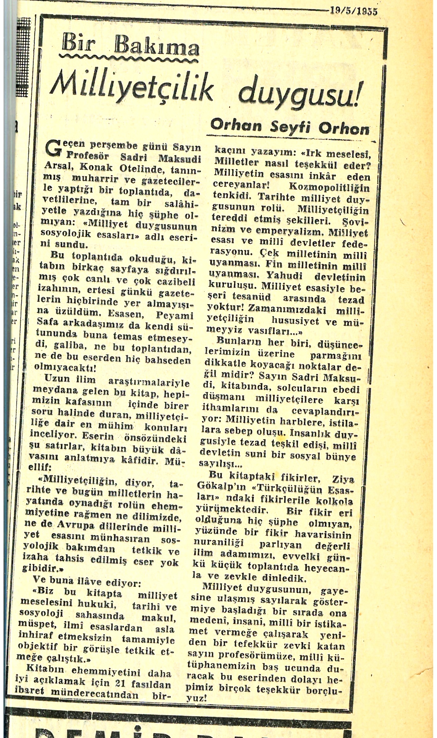- Orhon, Orhan Seyfi, Milliyetçilik Duygusu, Zafer Gazetesi, 19 Mayıs 1955.